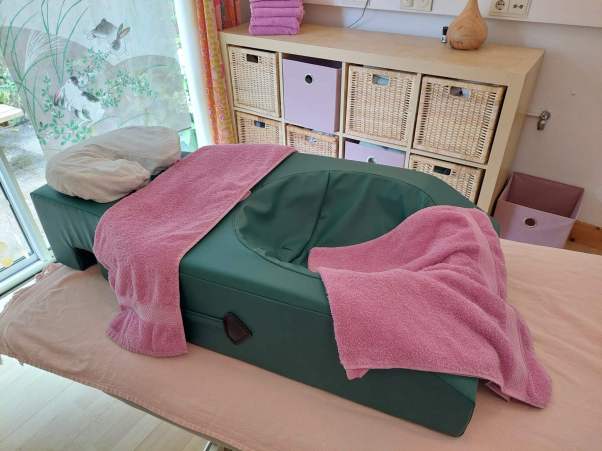 Het is helemaal aan jou hoe deze massage wordt opgebouwd. Je kan er zelf voor kiezen hoe je wordt gemasseerd, dit kan liggend op een heerlijk zacht zwangerschapskussen met ruimte voor je buik, of zittend op de massagestoel of in zijligging op de massagetafel. Het kussen is speciaal ontworpen voor zwangere vrouwen. De massagestoel is een stoel speciaal ontwikkeld om in zithouding op een comfortabele manier gemasseerd te worden. In rugligging op de massagetafel kun je een heerlijke hoofdmassage krijgen, ook voor de armen en de benen bv voor vermoeide benen.